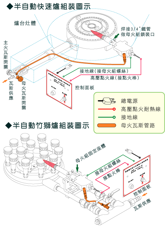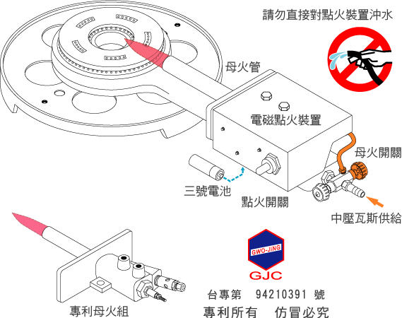 | 專利母火組可適用於各式瓦斯爐具,也可因使用環境的不同做組裝上的靈活變化。圖示範例如下: |